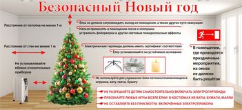 - елку не следует устанавливать около выходов, в проходах. Заполнение помещений людьми сверх нормативного значения не допускается. Елка должна устанавливаться на устойчивом основании с таким расчетом, чтобы ветви не касались стен и потолка. Помещение, где находится елка, должно быть обеспечено первичными средствами пожаротушения (огнетушители, песок, кошма);